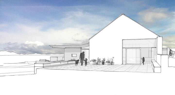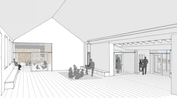 Option A – Adapted Hall: New spaces creating sheltered terrace area with projecting roofs providing additional shelter.