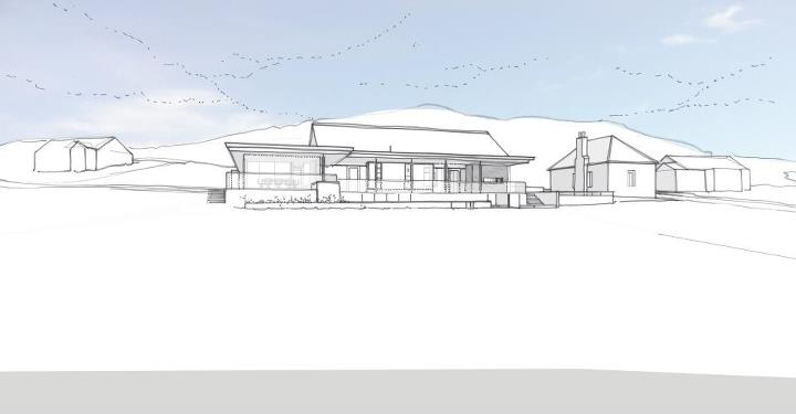 Option A – Adapted Hall: view from the east, with meeting room to left hand side. At this early stage it is thought that the building may have a stone base, and a mixture of slate roofs and sedum/green roofs or possibly low pitched zinc roofs over the new spaces.