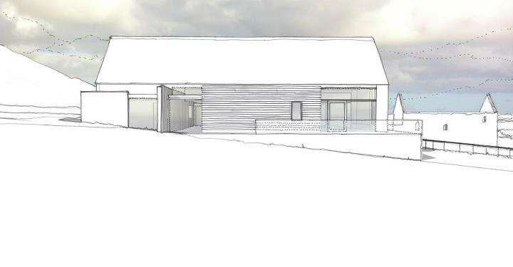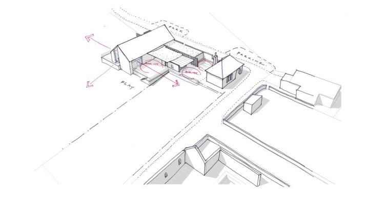 Option B – New Build Hall: proposals from the south-east. Initial thoughts are that the main hall may be white render with slate roof, sitting on a stone base, with some sections of wall in naturally weathered timber.