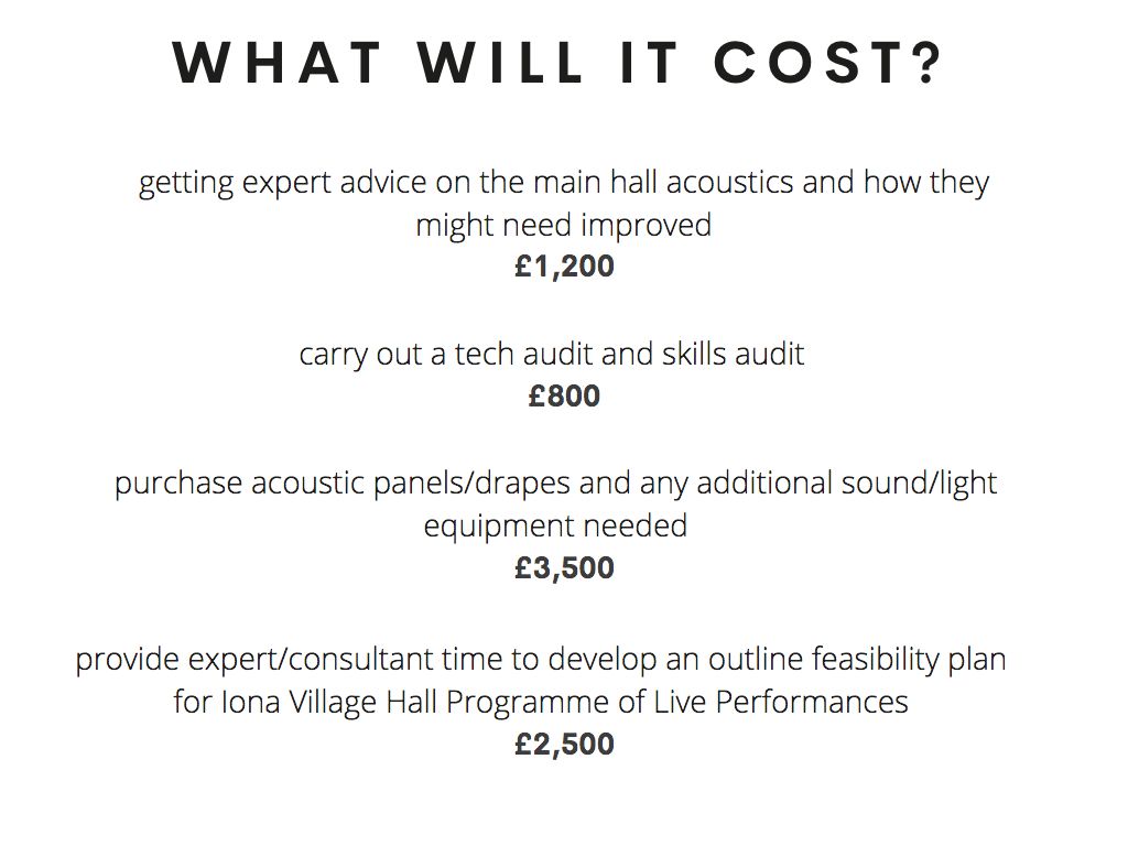 provide expert/consultant time to develop an outline feasibility plan for Iona Village Hall Programme of Live Performances